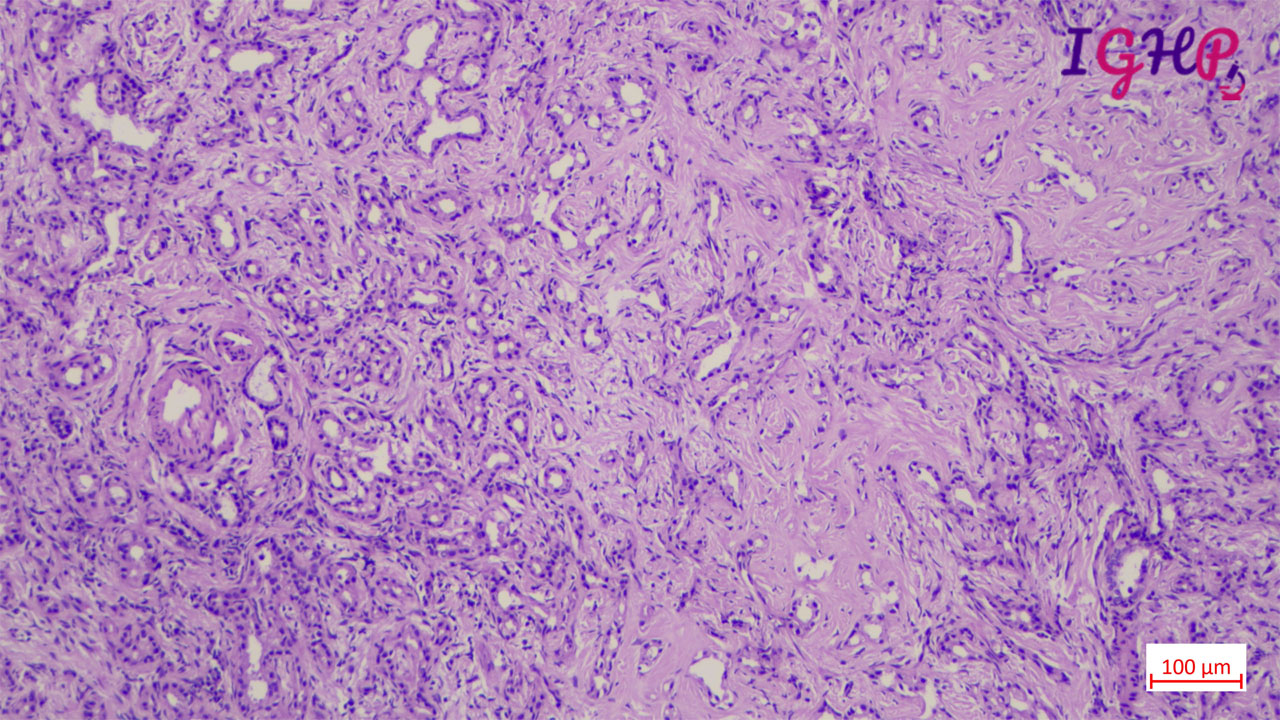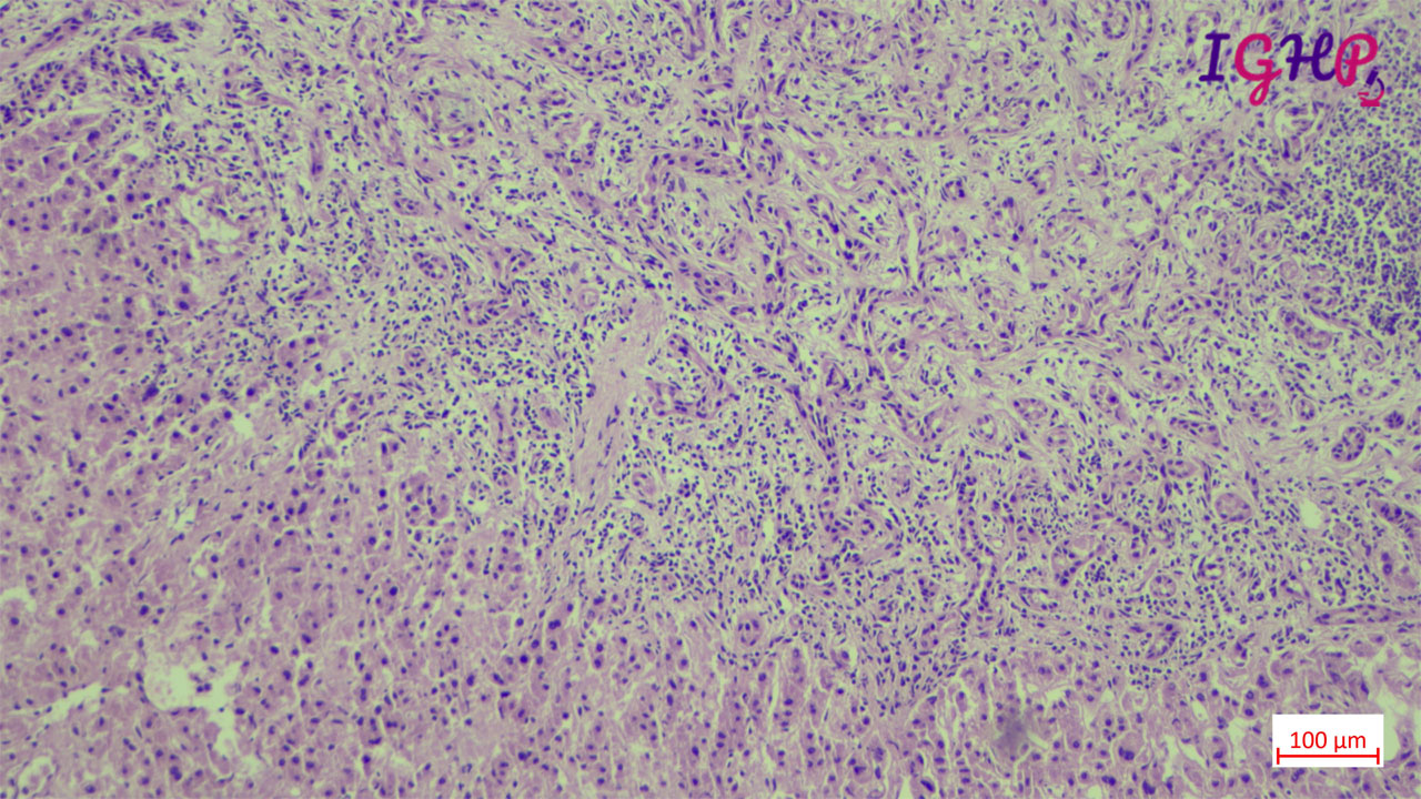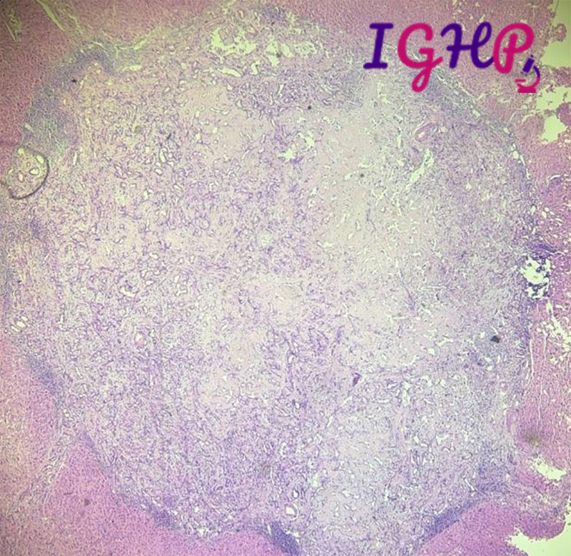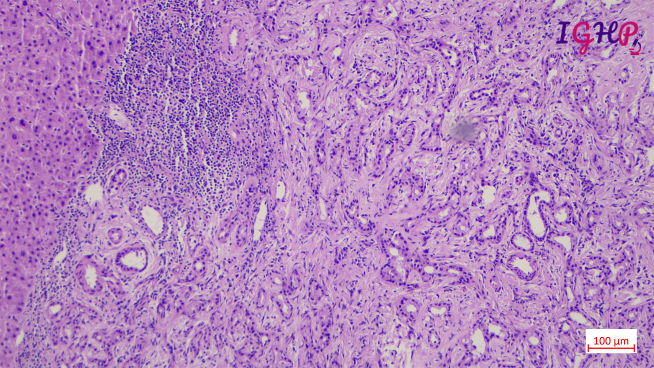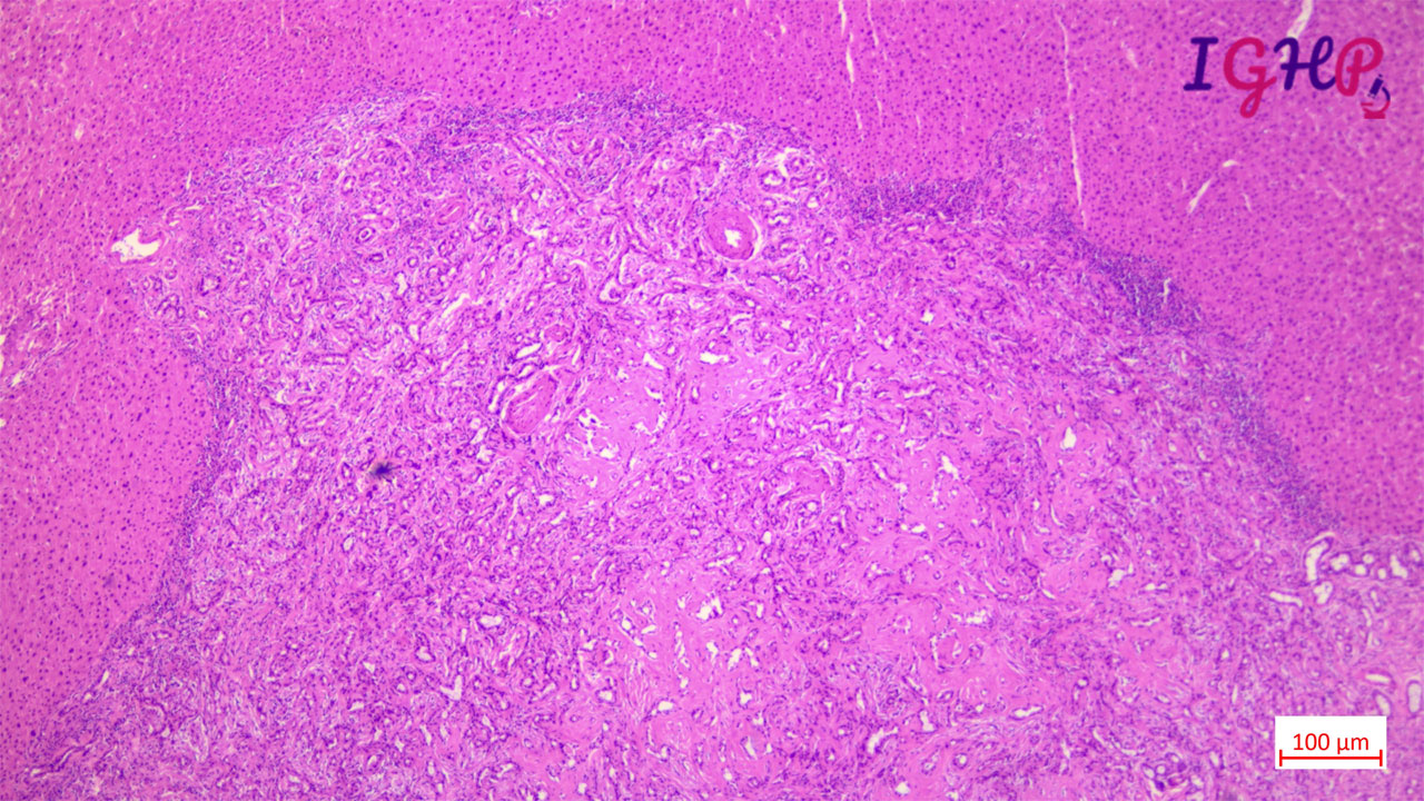 Microscopic examination showed an unencapsulated proliferation of uniformly spaced ductules lined by bland, cuboidal epithelium in a collagenous stroma. The architecture seems non-infiltrative, with evidence of entrapped native portal tracts present within the lesion itself.
