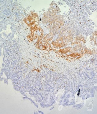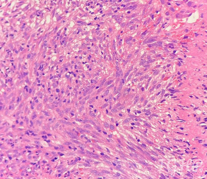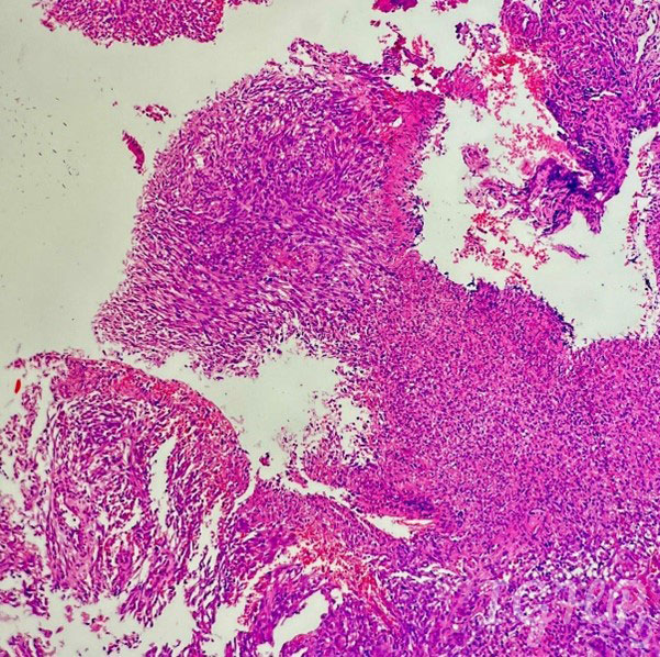 Histology images showed bits of ulcerated small bowel mucosa with presence of proliferated spindle cells in ulcer bed.