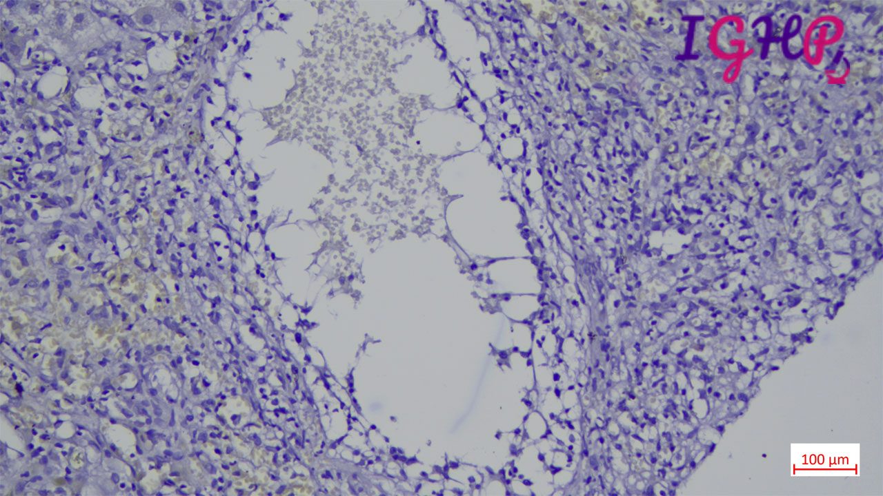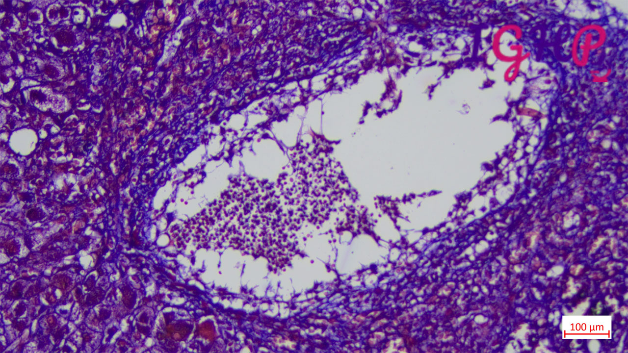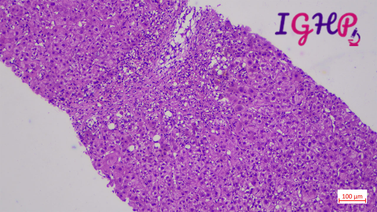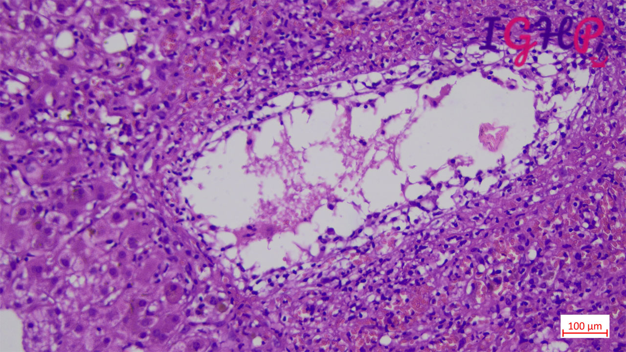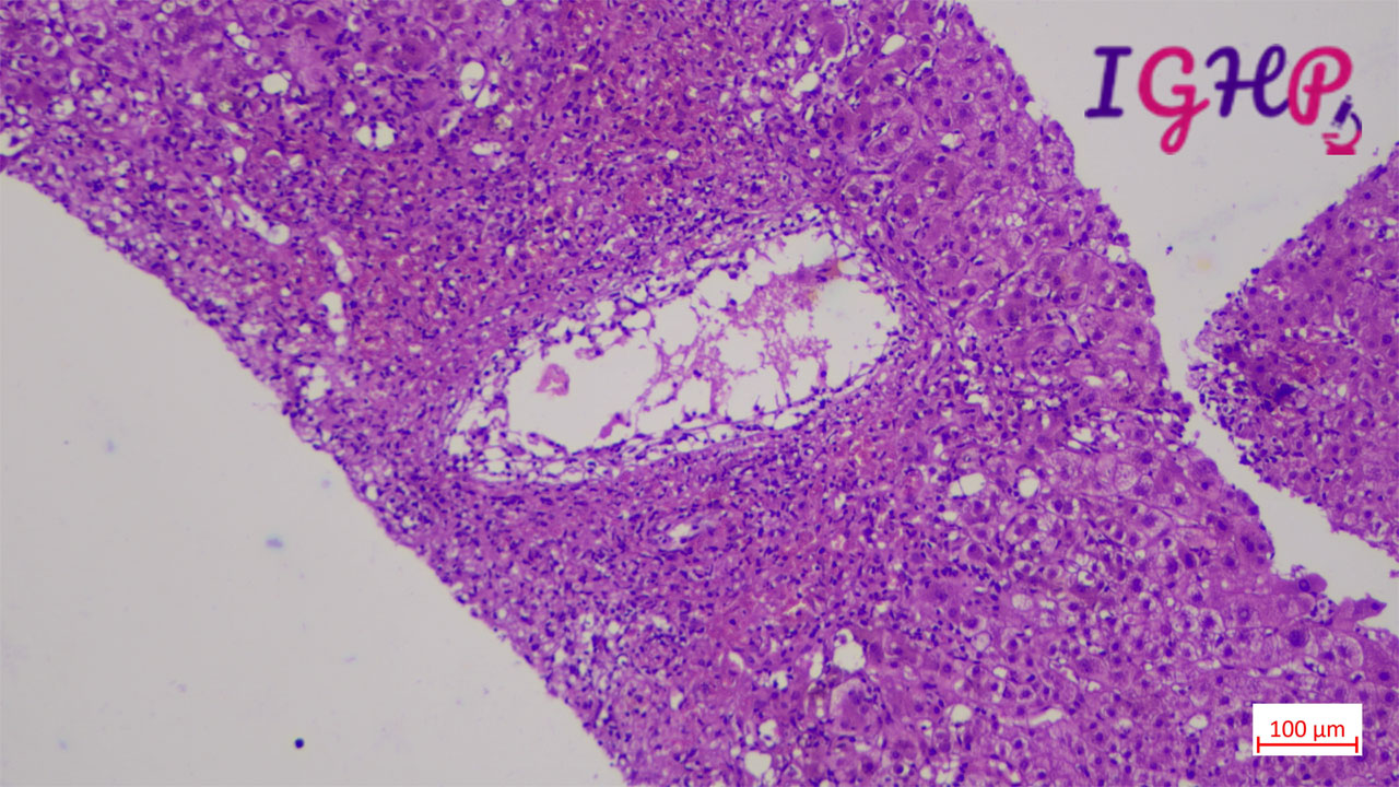 Microscopic examination showed an areas of perivenular hepatocyte loss with prominent central perivenulitis.