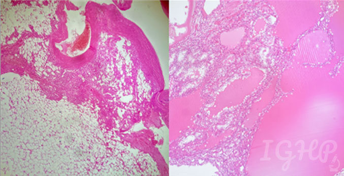 Microscopic examination from the large mass revealed a classic triphasic pattern consisting of mature adipose tissue, myoid spindle cells, and several thickened and dysmorphic blood vessels of varying sizes. Microscopy from the small discoloured cystic area in middle pole showed features of multilocular clear cell renal cell neoplasm of low malignant potential.