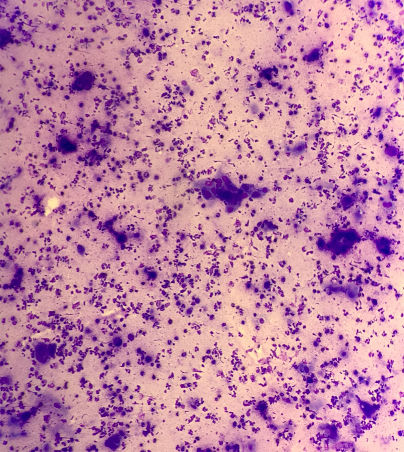 FNA from SOL Lung with dirty necrotic background MGG stain