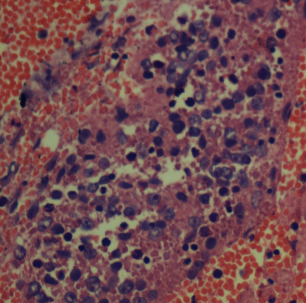 Cell Block lymph node aspirate show large binucleate cell with owl's eye inclusion